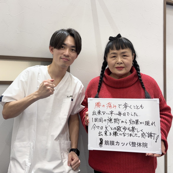 「腰の痛みで歩くことができず、辛い毎日でした。廿日市のカッパ整体に出会い、今では犬との散歩も楽しくできるようになりました!」